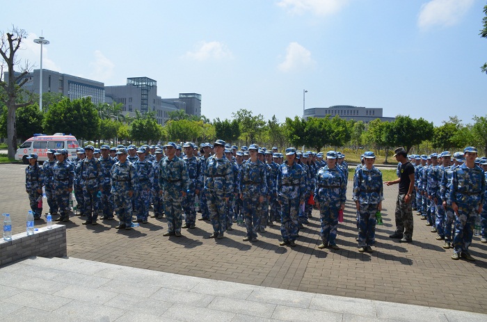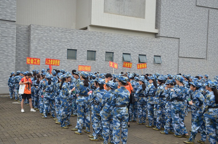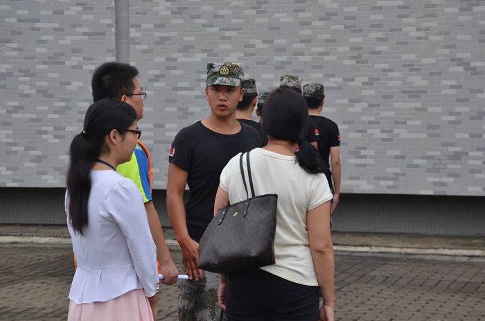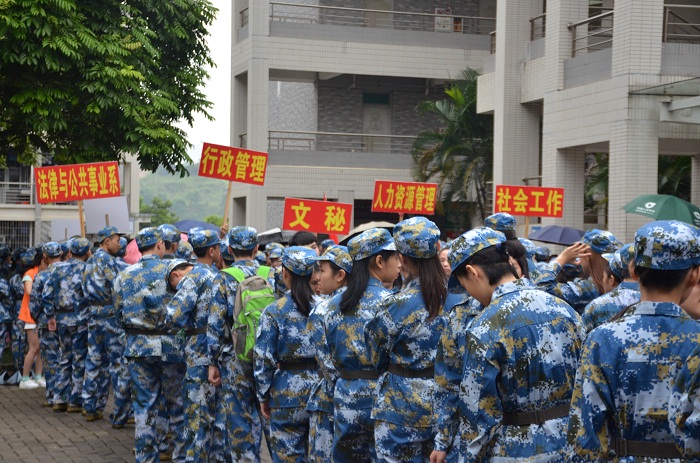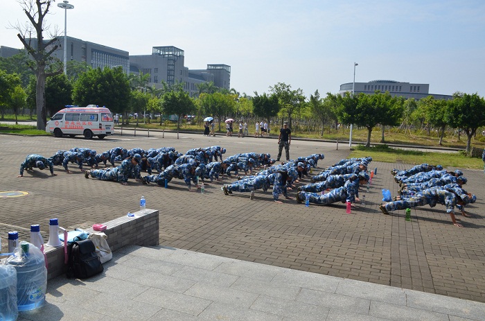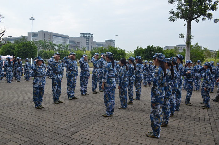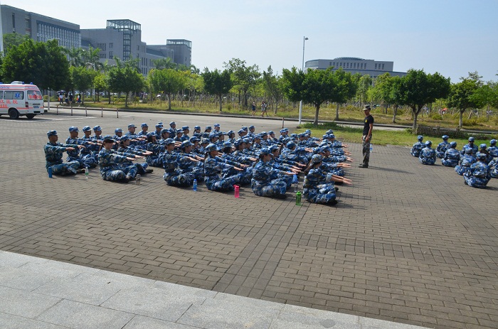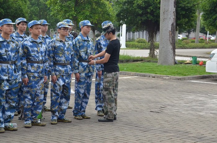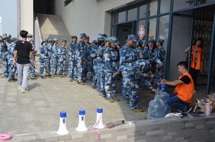 下午16:20分开始,天空的阳光开始消失,风越吹越大,教官安排同学们稍作休息。在这间隙,教官开始教唱军歌,集体合唱《团结就是力量》,并让同学们轮流表演个人节目,气氛顿时轻松活泼起来。还没等到下一次训练开始,狂风中开始夹杂着雨水,雨越下越大,同学们不得不进入体育馆避雨。各首军歌在体育馆内此起彼伏,简直是一场全校新生军训大联谊呀。突然哨声响起,全体新生立马噤声,起立,注视着在体育馆中央站着的总教官,等待总教官训话。总教官向全体新生强调团队精神及要注意自身安全,到了不能承受时要打报告休息。晚上19:30分,教官们在工作人员的陪同下开始在各宿舍教授内务的整理标准和要求,并对每个细节都进行了一一示范。20:10分,检查教官开始检查内务,虽然有部分宿舍出现一些小问题,但总体还是符合标准,希望同学们能够把这内务标准一直延续下去。