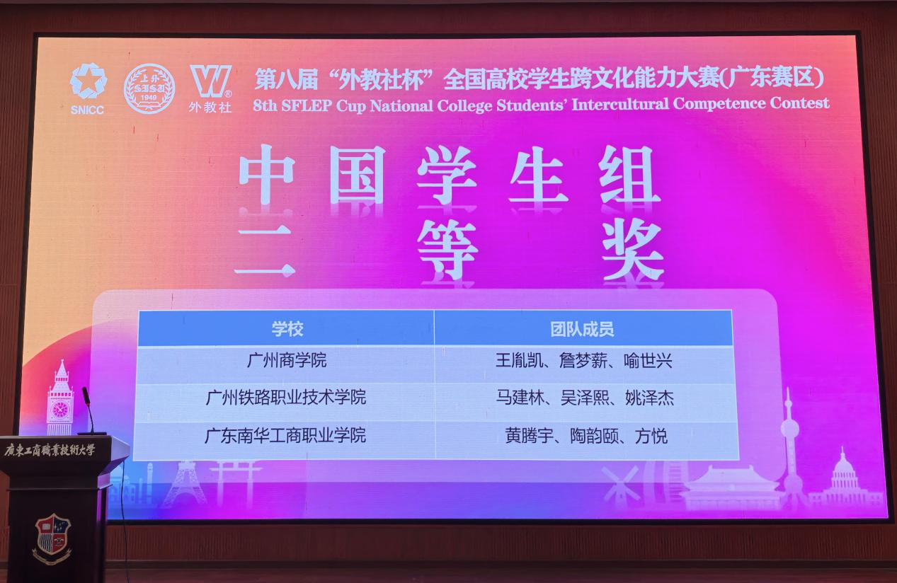 11月15日,第八届“全国高校学生跨文化能力大赛”广东赛区中国学生组决赛在广东工商职业技术大学圆满落幕,我校参赛团队斩获省级二等奖,与中大、华农等本科院校同台竞技交流。