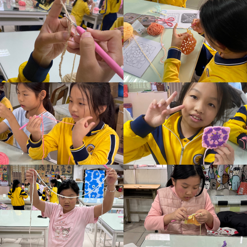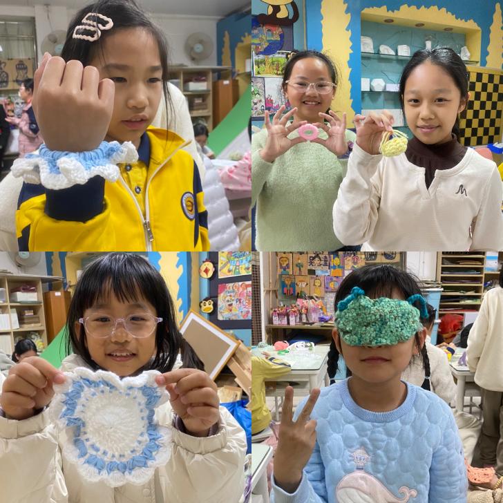 本次课堂是钩针编织课程的第六次授课,课堂重点从“学习技法”转向“自由创造”。主讲教师李辰以“我的设计”为主题,鼓励孩子们将钩织融入日常生活。经过前五次课堂的练习,孩子们已经从初次执针的生涩,进化到如今指尖流淌创意生花,能独立钩织出圣诞树挂饰、眼罩、迷你小包等个性化作品。六次钩针编织课,让孩子们经历了技能上的蜕变,也让他们尝到了劳动创造的甜美果实。