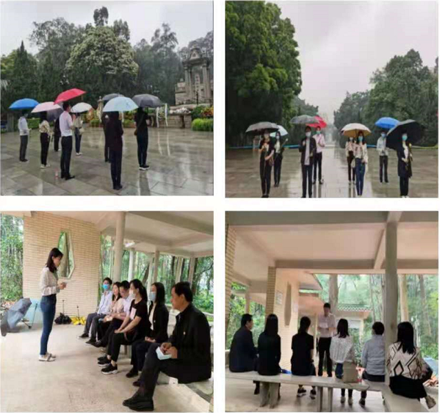 4 月 8 日上午,阴雨绵绵,在黄立芳书记的带领下,支部全体党员和入党积极分子冒雨前往黄花岗七十二烈士墓园开展“清明祭英烈”主题党日活动。来到烈士墓园,大家通过敬献鲜花、肃立默哀、瞻仰烈士墓等方式向革命先烈寄托哀思,表达对烈士的崇高敬意和深切的缅怀。同时,通过学习黄花岗烈士墓的革命历史背景以及习近平总书记关于崇尚英雄、缅怀先烈的重要论述,大家进一步深刻感受到“抗战英雄是中华民族的脊梁,抗战英雄的事迹和精神是激励我们前行的强大力量”。我们要铭记一切为中华民族和中国人民作出贡献的英雄们,崇尚英雄,捍卫英雄,学习英雄,继承和发扬革命先烈的爱国主义精神,立足岗位,敬业奉献,用实际行动践行共产党员的初心和使命。