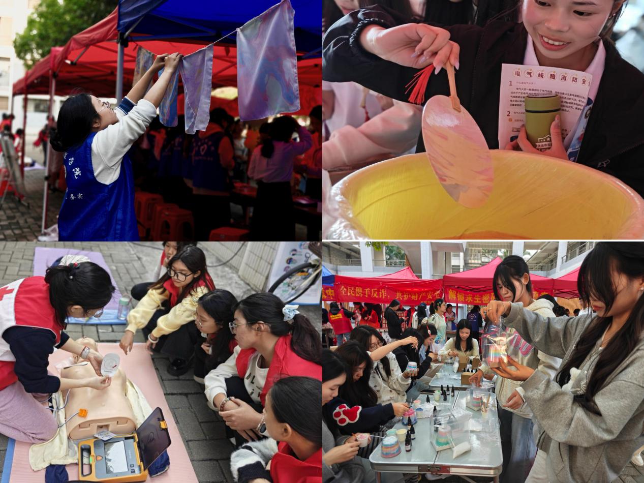 活动现场,七大主题摊位巧妙融合思想政治教育理论、校园安全知识、宪法知识、急救求生技能实践与非遗文化传承,以趣味化、场景化的设计构建起立体化教育矩阵,为师生们带来别开生面的体验。摊位活动还设有互动奖励机制,师生在各摊位“闯关成功”即可收集印章,兑换相应手工体验及纪念品。