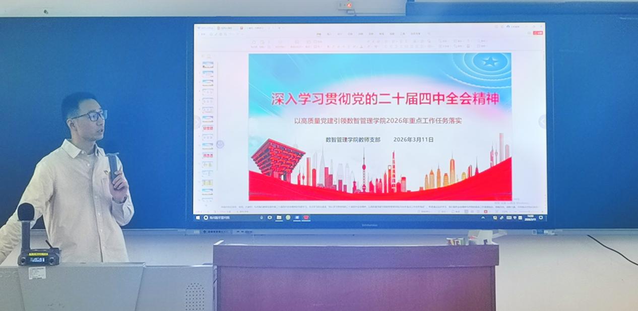 为深入学习贯彻党的二十届四中全会精神,进一步坚定党员理想信念,增强支部凝聚力和向心力,数智管理学院教师党支部于2026年3月11日下午2点在一教212教室组织开展专题学习会。本次会议由教师党支部副书记黄志伟主持,支部全体党员教师参加。