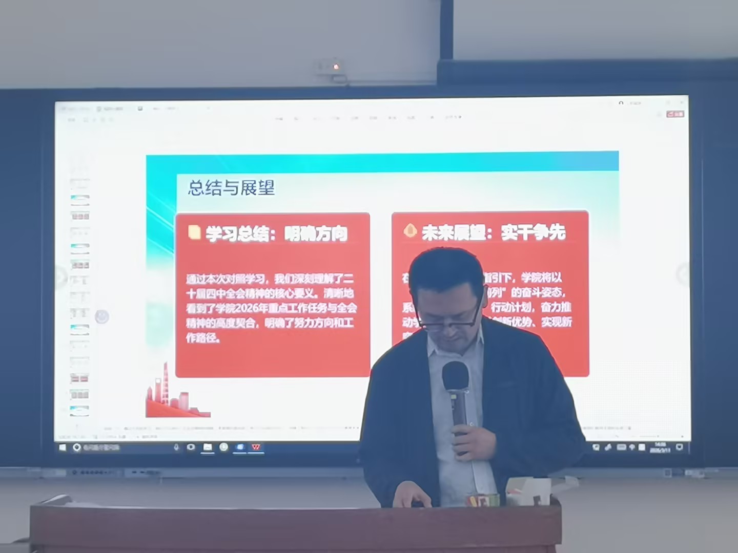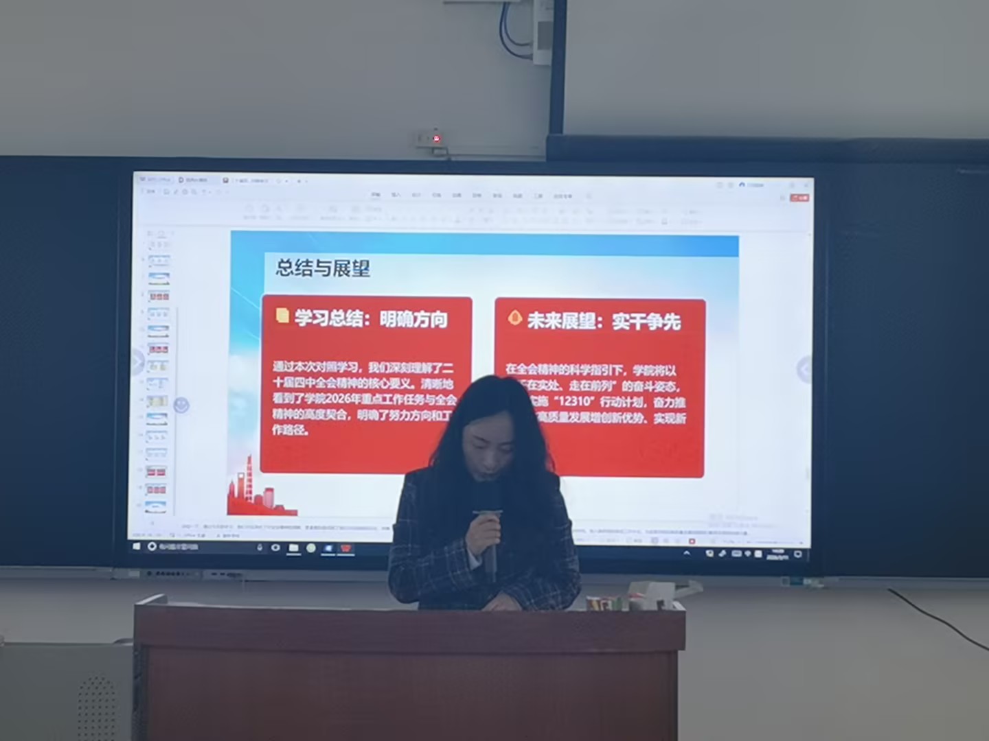 黄志伟系统解读了党的二十届四中全会召开的时代背景、重大意义及核心内涵,并结合学院2026年重点工作任务清单,强调要将全会精神贯穿于学院教学、科研、人才培养等各项工作之中,以改革创新的姿态推动学院高质量发展,助力“新双高”建设及市域产教联合体打造。