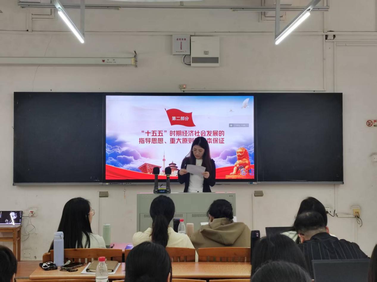 3月18日,第二期培训在一教316教室继续进行。本期培训由郑颖钧同志进行第一议题领学,查萍同志作学习分享。核心课程《“十五五”时期经济社会发展的重大战略任务》由学生党支部书记余舒敏主讲,重点讲解了“十五五”时期的各项战略部署,使师生党员对国家未来发展的重点任务有了更清晰的认识和把握。