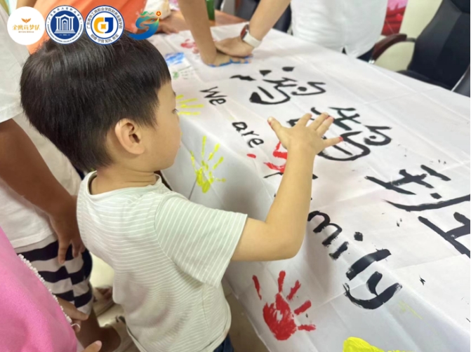 日暮时分,我们迎来了本次活动的压轴环节——盖彩色手印旗帜。在这面旗帜上,小朋友们都留下了自己的手印,每一个手印都代表着我们对美好未来的期许和承诺,这面旗帜将成为我们共同的记忆和见证,激励我们在今后的日子里不断追求进步和发展,为实现中华民族伟大复兴的中国梦贡献自己的力量!