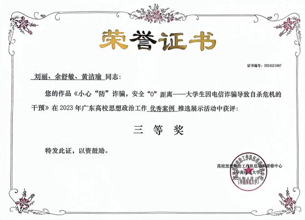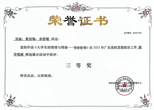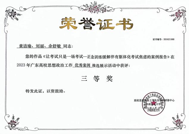 广东省教育厅2023年“5·25”大学生心理健康教育月系列活动三等奖 |