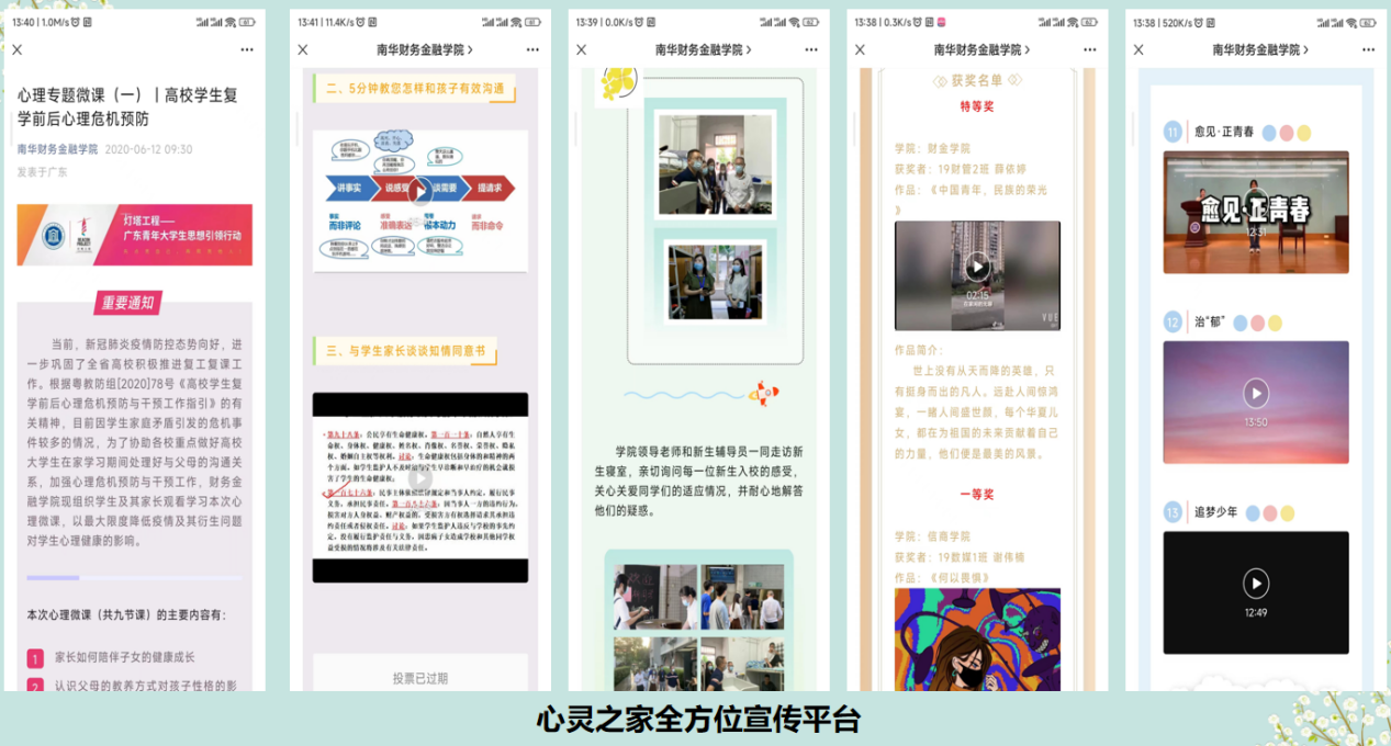 心灵之家全方位宣传平台:线上线下相结合,多维度提升学生与家长的心理健康意识。通过开展“家-校”微课、主题讲座、“致家长的一封信”等活动联动,有助于加深对学生的了解,精准定位学生的心理问题,并进行精准干预;同时,对问题家长开展必要的心理教育,让家长关心自己的孩子,让学生在家长的正确教育下得到身心健康的全面发展,充分发挥心理育人的作用。