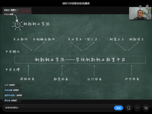 训练营直播课程由院长余喜文老师主讲,他针对师生反映的参赛中的突出问题,分别讲授了创新方法和项目来源、商业模式及分析,创业计划书的撰写,路演PPT制作及表达技巧。