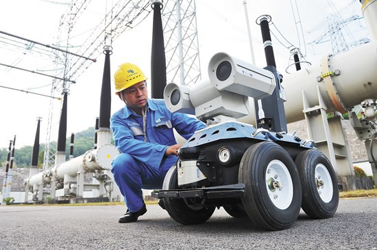 南方电网广东中山供电局青年研发的500千伏桂山变电站巡视机器人“大眼萌”
