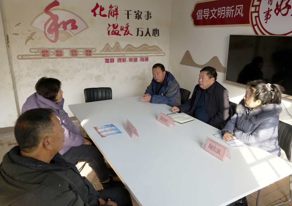 在河南省宝丰县闹店镇范营村“摆理堂”,村镇干部(右)为村民进行信访调解(2023年12月20日摄)。河南省宝丰县积极推进四下基层工作深入开展,已打造闹店镇范营村“摆理堂”、石桥镇东大庄村“老娘舅茶室”等系列乡村社区服务阵地,协调邻里关系,有效化解各类矛盾,同时不断丰富工作内容,拓展服务功能,助力乡村振兴。新华社记者 李嘉南 摄