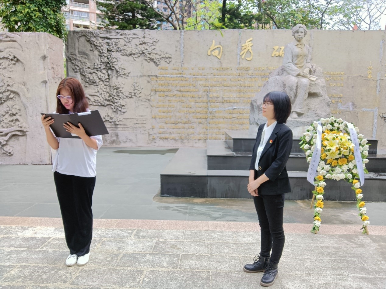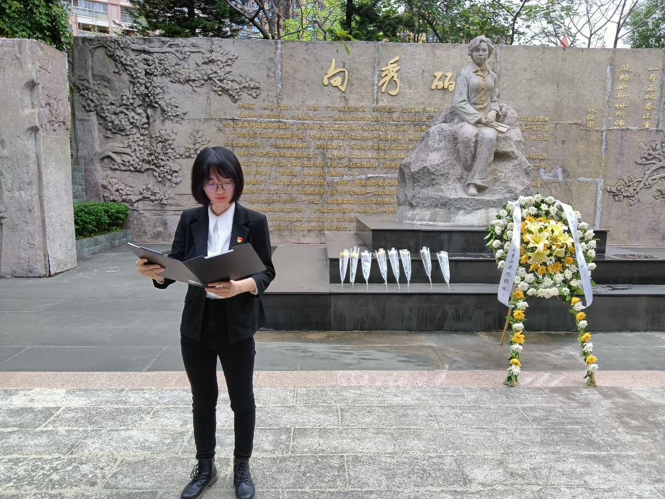 活动开始,2019级入党积极分子方晓冰作向秀丽烈士事迹报告。随后,集体默哀、献花瞻仰烈士雕像,并现场重温入团誓词。党员同志柯沛葱在烈士雕像前献辞。她表示,今年是建党一百年周年,学党史跟党走是贯穿全年的主题,作为入党积极分子、入党申请人,应该主动学习党内先烈的英勇事迹,依循先辈的足迹,传承英烈的精神,并将其弘扬传颂。