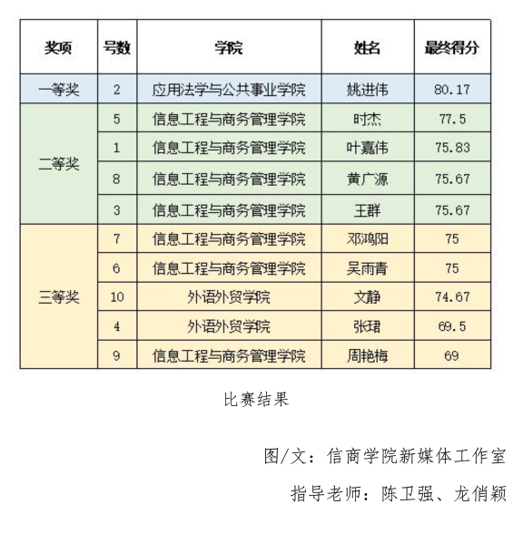2021年6月9日下午2点30分,评委老师在教学楼324线下进行评分。担任本次比赛的评委有创新创业学院肖凯元老师、信息工程与商务管理学院龙俏颖老师、应用法学与公共事业学院汤泳怡老师、外语外贸学院唐嘉敏老师以及其他二级学院学生干部代表。经过评委们专业评选后,最终评出一等奖1名,二等奖4名,三等奖5名。