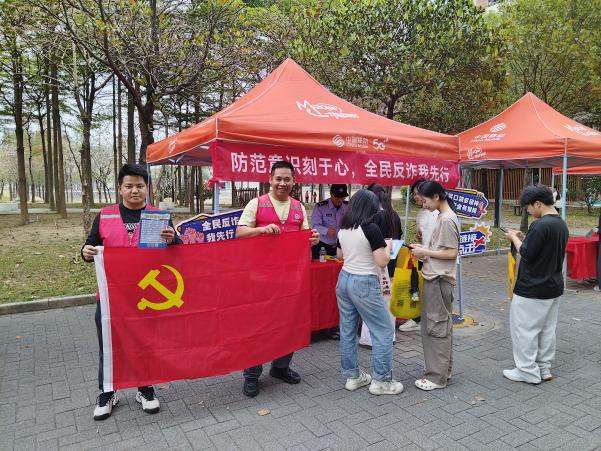 与此同时,宿舍楼下的摆摊宣传活动也在同步进行。活动现场设置了多个宣传摊位,分别围绕防诈骗知识、交通安全、禁毒知识、国家安全知识展开宣传。工作人员通过发放宣传手册、展示宣传展板、讲解真实案例等方式,向过往学生普及相关安全知识。为了提高学生的参与积极性,活动还准备了丰富的奖品,只要学生们参与知识问答、扫码关注反诈公众号等互动环节,就有机会获得精美礼品。学生们纷纷踊跃参与,在轻松愉快的氛围中学习到了实用的安全知识。