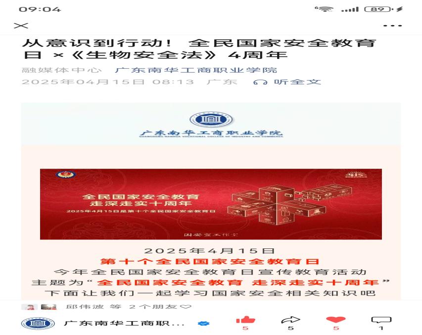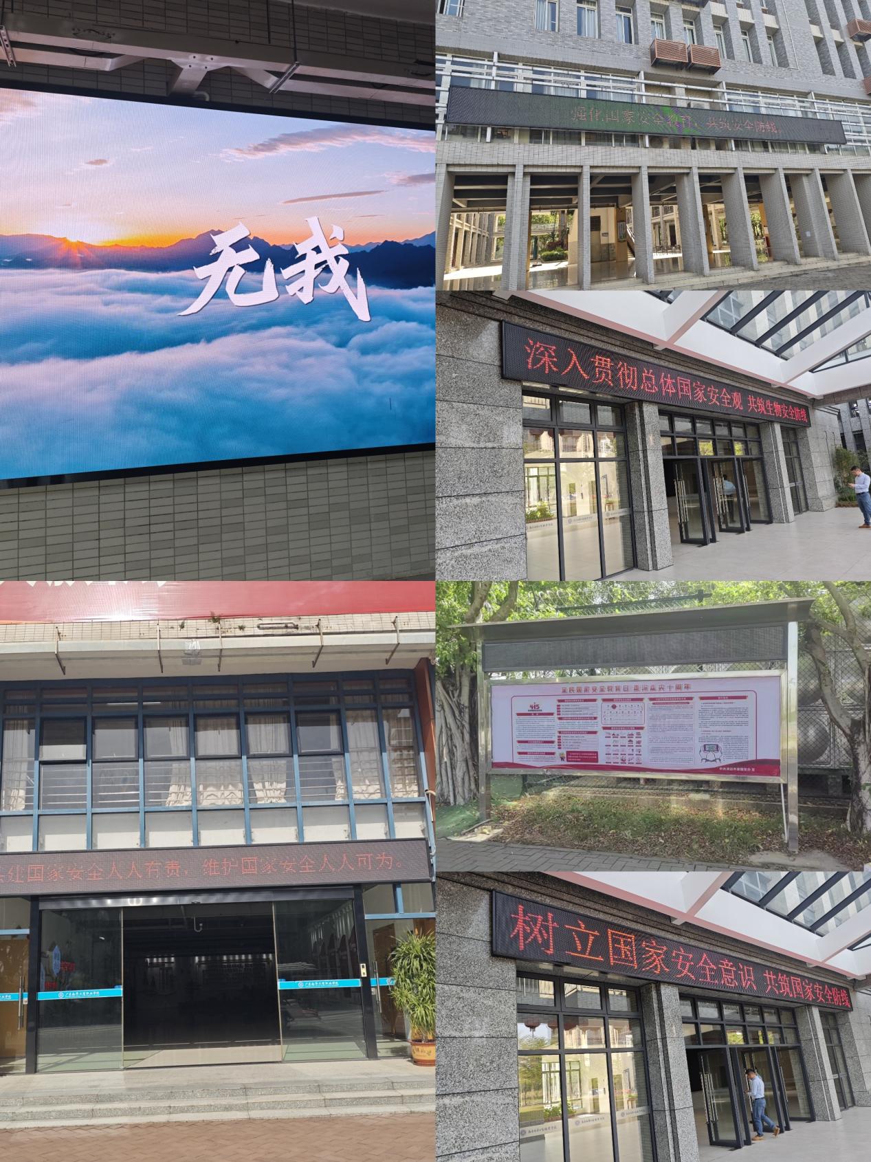 此外,校园粘贴主题海报、图书馆、教学楼播放国家安全电子横幅“强化国家安全教育,共筑安全防线”、“共建国家安全人人有责,维护国家安全人人可为”、“维护国家安全,共筑和谐校园”、“全民参与反诈,守护钱袋子安全”等横幅,学校饭堂及学校户外LED屏幕循环播放国家安全知识短视频,组宣部组织在学校官方微信公众号同时发布关于国家安全知识推文,与现场活动形成立体宣传矩阵,营造出“处处可见、时时提醒”的安全氛围。