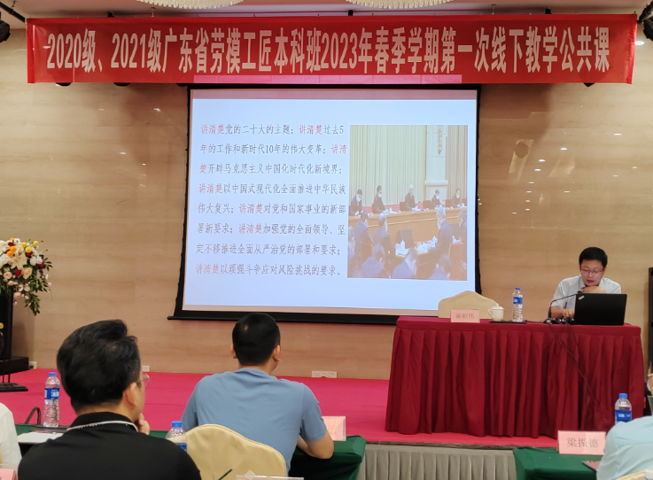 为了对于劳模工匠群体在劳模工匠本科班的学历提升学习过程中,进行更加深化的思想引领,本次线下教学活动公共课授课邀请到了华南师范大学马克思主义学院蒋积伟教授,蒋积伟教授为2020级和2021级广东省劳模工匠本科班学员在广东劳模疗休养基地J栋多功能厅进行授课——《奋进新征程的政治宣言和行动纲领——党的二十大精神解读》。蒋教授从三个方面:(1)党的二十大召开的重要意义;(2)过去五年的工作和新时代十年的伟大变革;(3)开辟马克思主义中国化时代化新境界。进行解读了党的二十大精神,解读“五个牢牢把握”:要牢牢把握过去5年工作和新时代10年伟大变革的重大意义,牢牢把握新时代中国特色社会主义思想的世界观和方法论,牢牢把握以中国式现代化推进中华民族伟大复兴的使命任务,牢牢把握以伟大自我革命引领伟大社会革命的重要要求,牢牢把握团结奋斗的时代要求。讲清楚党的二十大的主题;讲清楚过去5年的工作和新时代10年的伟大变革;讲清楚开辟马克思主义中国化时代化新境界;讲清楚以中国式现代化全面推进中华民族伟大复兴;讲清楚对党和国家事业的新部署新要求;讲清楚加强党的全面领导、坚定不移推进全面从严治党的部署和要求;讲清楚以顽强斗争应对风险挑战的要求。