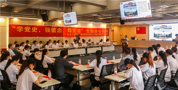 随后,武一婷同志一行到图书馆方形报告厅,深入到信商学院2019级工商2班团支部参加主题团日活动。本次主题团日活动以“学党史、强信念、跟党走”为主题,结合“云旅游”“谈感悟”“读诗文”“观视频”“唱赞歌”等多种形式开展。团支部全体同学共同观看建党百年主题短视频《中国共产党百年述职报告》,五位同学现场讲解,带领大家进入历史长廊,从浙江嘉兴“红船精神”、江西“井冈山精神”、贵州“遵义精神”、陕西“延安精神”和河北“西柏坡精神”五个历史定位,“云旅游”打卡红色地标,学习解读精神内涵,重温奋斗历程。同学们积极踊跃抒发感想,谈感悟。诗歌朗诵《今天,我们这样爱国!》,深情告知祖国母亲我们内心深沉的爱意和肩上重大的责任。班级大合唱《没有共产党就没有新中国》颂出中国共产党建党以来波澜壮阔的历史征程,感召青年学子的责任与担当。
