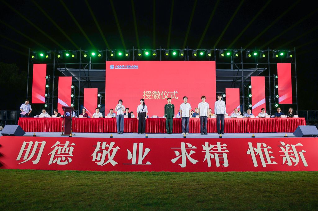 最激动人心的时刻,校领导为新生代表佩戴校徽,全体新生集体宣誓,嘹亮誓言响彻夜空,象征2025级新生正式加入南华校园大家庭。