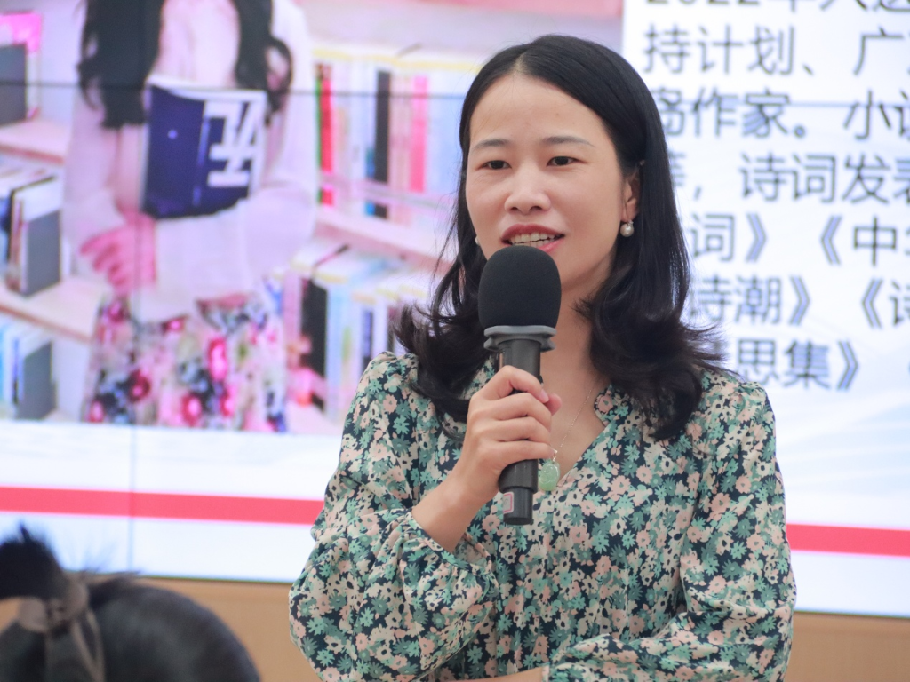 罗小娟现任中国作家协会会员,佛冈县公益文学网校校长,清远市作家协会副主席兼秘书长,清远市诗社副社长,《飞霞》杂志编辑等。她的文学创作以诗歌、散文见长,作品多见于《诗刊》《星星》等文学期刊,曾出版诗集《梦思集》《蘸桃花》等。她以“文学初心与梦想”为主线,分享了自己从初学诗词到发表作品、遇见良师的成长历程。罗小娟通过《分取月光一点点》《萤火虫》等诗作,阐释了文学创作中“分取月光一点点,开合总是照人心”的创作理念,强调文学道路上同行者的重要性。围绕“文学征程的挑战与坚持”,罗小娟讲述了历时三年申请加入中国作协的经历,以“欲上青霄登月望,枇杷深处是家乡”表达了对更高文学目标的追求。现场她还分享了《生姜发芽有感》《佗城》等代表作,展现其在爱情、生活、乡愁等主题上的创作实践。