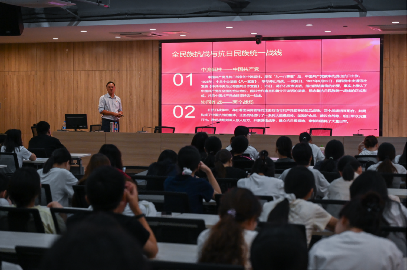 课程系统梳理了抗战时期的全民族抗战历程,以时间轴串联起抗战史中的关键节点,并通过抗战时期“小米加步枪”的艰苦条件与九三阅兵的现代化装备形成时空对照,直观呈现我国国防实力从“站起来”到“强起来”的跨越式发展。许典榕表示:“阅兵不仅是对国防成就的检阅,更是对和平理念的宣示——中国始终走和平发展道路,但维护国家主权与领土完整的决心坚如磐石。”他希望学院全体师生要传承抗战精神中“天下兴亡、匹夫有责”的爱国情怀,传承国防现代化进程中“自力更生、创新突破”的科研精神,传承新时代青年“强国有我、不负韶华”的使命担当,将把爱国情、强国志转化为报国行。