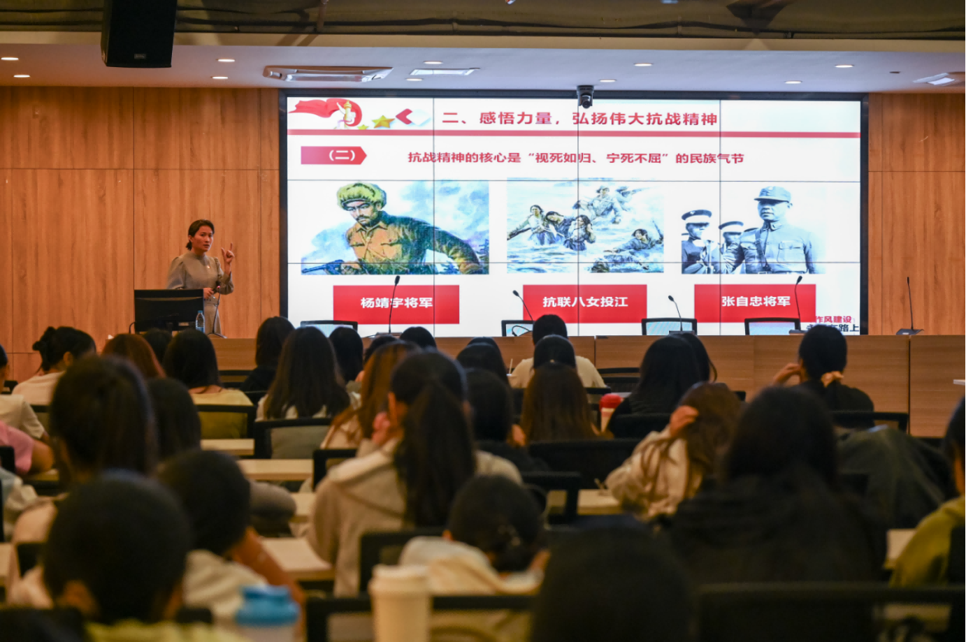 课程以“九三阅兵”为切入点,回顾了从九一八事变到南京大屠杀、从淞沪会战到百团大战的十四年抗战史,展现了抗战精神作为“民族精神丰碑”的深刻内涵和时代价值。赵玲霞认为,抗战精神根植于中华优秀传统文化,形成于全民族救亡图存实践,在当下仍是“前行的动力”,其中的爱国情怀、团结协作、坚韧毅力,正是青年克服学业困难、投身社会服务的“精神火炬”。她呼吁广大师生要将个人兴趣与国家需要结合,“让精神之火永远燃烧”,在民族复兴征程中书写精彩篇章。