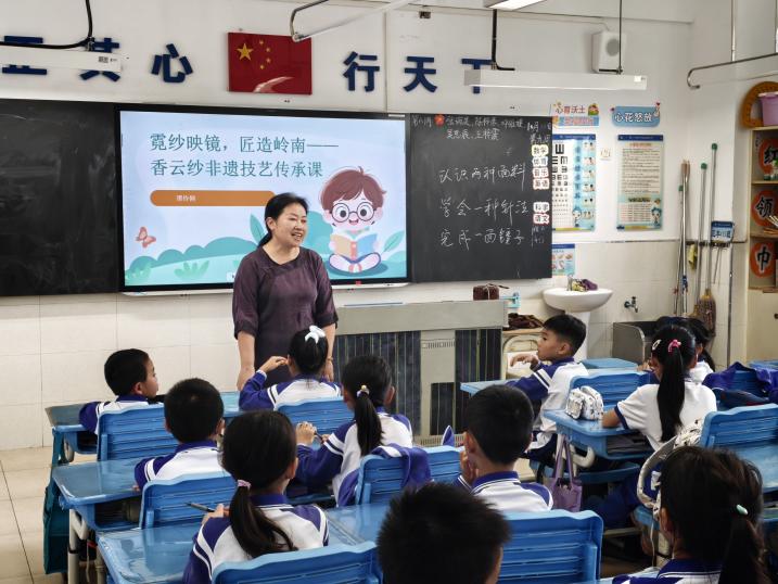 “谁知道香云纱为什么又叫软黄金?”谭伶俐老师一句话点燃了课堂气氛。她通过短视频、实物触摸,带领学生追溯香云纱“三蒸九煮十八晒”的繁复工序,讲述岭南河泥与阳光共同写就的“黑色魔法”。孩子们第一次发现,原来传统织物也能变身镜子上的时尚纹样,惊叹声此起彼伏。