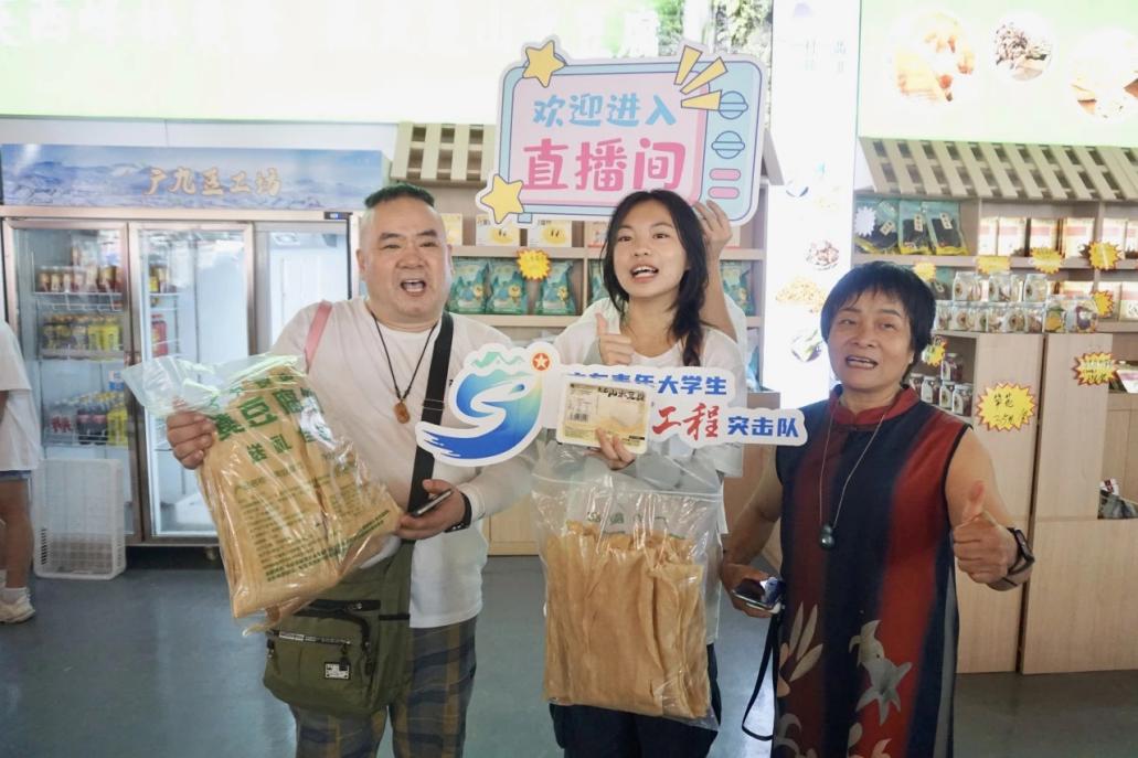 宣传推广上,实践团创意十足。一次偶然,我们偶遇国家二级演员“鸡公福”老师,队员在直播间转用地道粤语吆喝,吸引两万多人围观,让“九龙豆腐”声名大噪。此外,实践团还和广州青之梅开心乐园合唱团合作,举办“非遗+红歌”直播演唱会,点燃乡村夜晚,激发了大家对非遗的热爱。