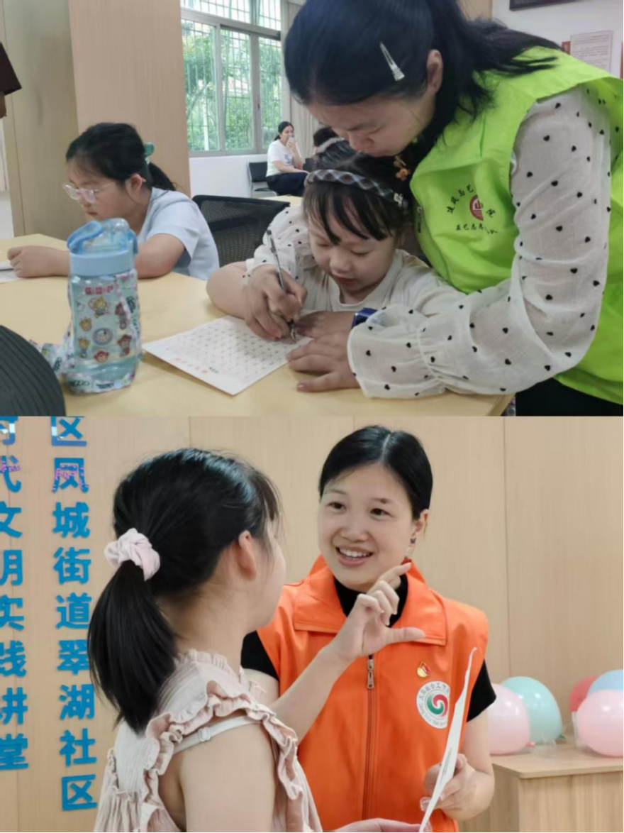 活动中,志愿者们率先开展硬笔书法教学。志愿者们从握笔姿势、坐姿等基础规范讲起,耐心示范基础笔画与汉字书写技巧,手把手指导小朋友规范练字,让孩子们在笔墨练习中感受中华传统文化魅力,养成认真专注的学习习惯。