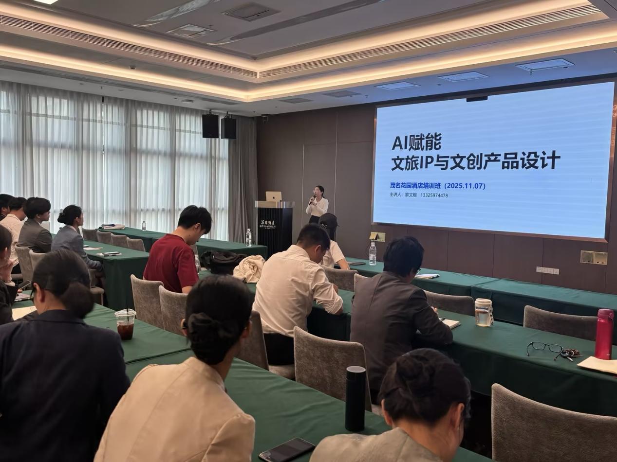 2025年11月7日下午,数字创意学院教师黎文煜前往茂名花园酒店,开展了一场主题为“AI赋能文旅IP和文创产品设计”的专题培训活动。此次培训班共有50名学员参与。在培训过程中,黎文煜老师采用了理论与实践相结合的教学方法,通过生动的实际操作和详尽的演示,深入浅出地讲解了相关内容。她不仅结合了多个成功案例,系统地为学员们剖析了文旅IP的打造思路及其核心要素,还详细阐述了文创产品的独特特点和市场需求。此外,黎文煜老...