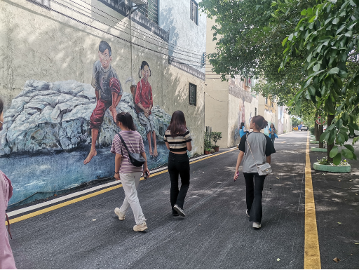 最后一站,同学们参观了新桥民宿村,经过统一规划重建后,民宿村的整体布局和风格与周边山水浑然一体,墙体上也绘制了非常具有本地特色的图案,村子里的环境整洁而又悠闲,2015年就通过评选成为“广东名村”,也是清远市的“美丽乡村”示范村。