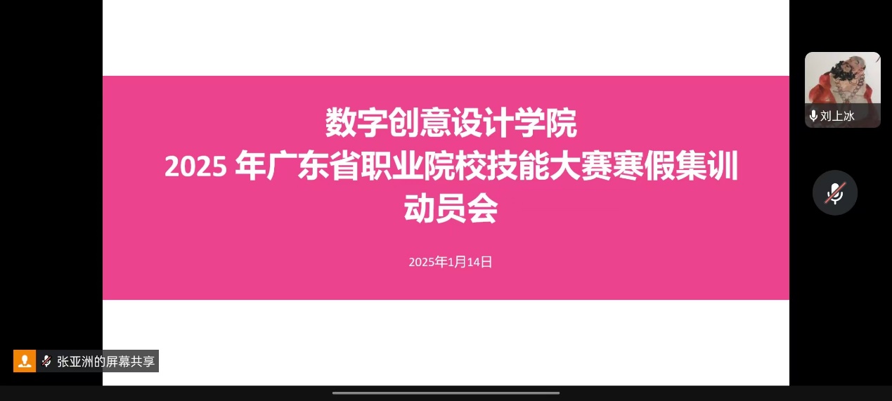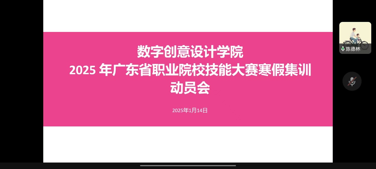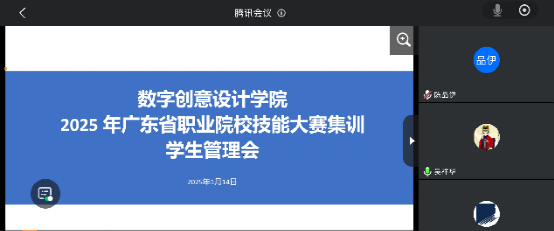 2025年1月14日,数字创意设计学院召开2025年广东省职业院校技能大赛集训动员会。学院党总支书记陈德林、学院负责人徐丹老师、专业群带头人刘上冰老师、学工办主任吴祥华老师以及各赛项指导老师参加,共同为即将到来的2025年省技能大赛吹响备战号角。
