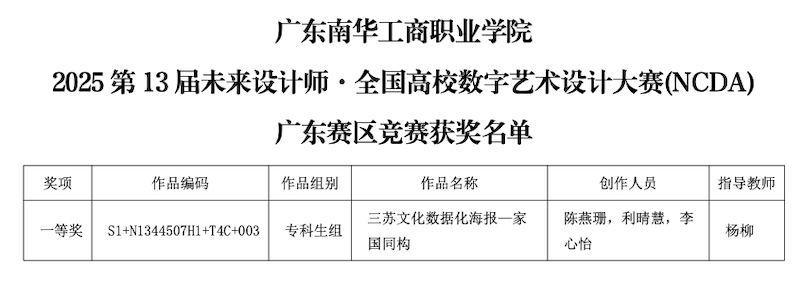 近日,第13届未来设计师-全国高校数字艺术设计大赛获奖名单正式公布,我院数字媒体技术专业学生陈燕珊、利晴慧、李心怡《三苏文化数据化海报——家国同构》获广东赛区省赛一等奖并进入国赛评审,杨柳老师获得优秀指导老师。