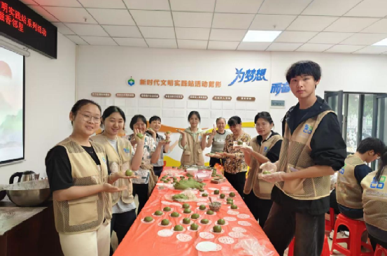 安全教育结束后,艾糍粑制作环节正式启动。社区工作人员提前备好新鲜艾草、糯米粉、馅料等食材,经验丰富的社区居民现场示范制作步骤,讲解艾草焯水、和粉揉面、包馅塑形的关键技巧。学院师生在“三种精神”的激励下——以工匠精神精研每一道工序,以劳动精神投入实践操作,以创新精神感悟传统民俗的当代表达——在动手过程中认识艾糍粑的形态之美,发现制作中的细节之美,欣赏邻里协作的和谐之美,并亲手创造出一枚枚翠绿饱满的艾糍粑,实现了“劳育”与“美育”的深度融合。