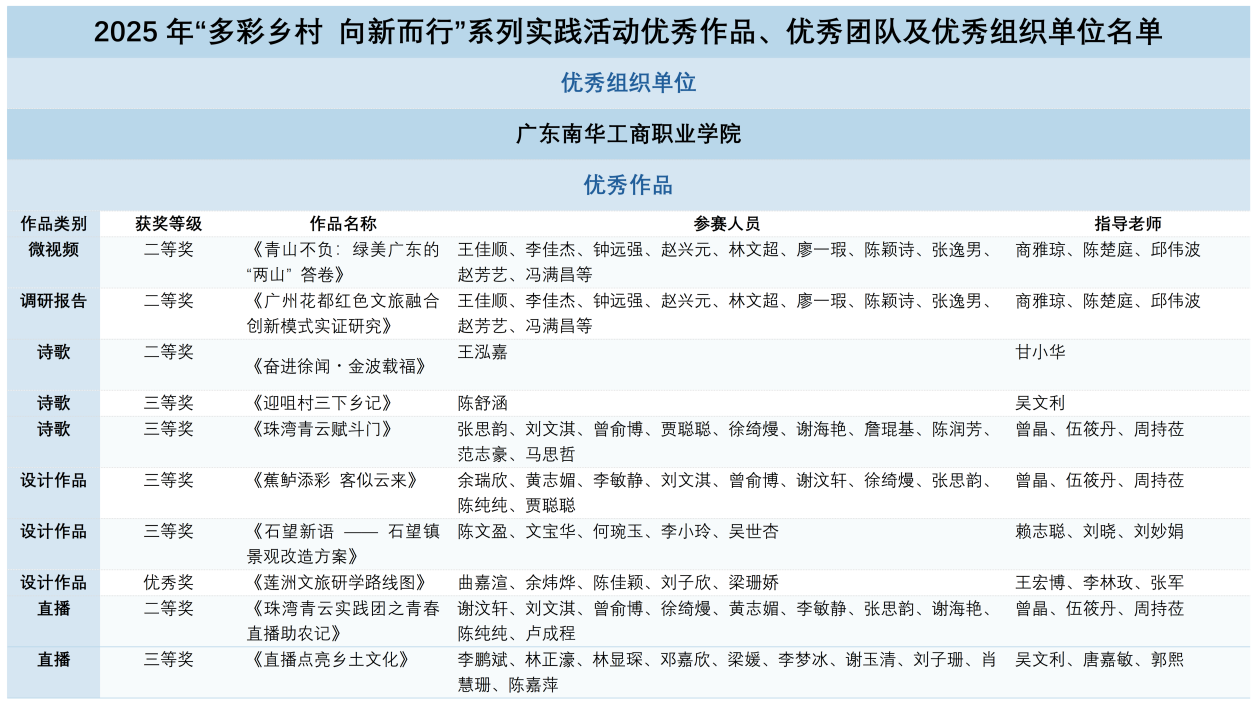 近日,由广东省人民政府地方志办公室、广东省教育厅、共青团广东省委员会等11家单位联合主办的2025年“多彩乡村 向新而行”系列实践活动公布评选结果。我校从全省各高校、中小学、镇街等单位提交的22687件作品中脱颖而出,荣获“优秀组织单位”称号。同时,我校师生凭借扎实的专业功底、新颖的创作视角与过硬的实践能力,斩获二等奖4项、三等奖5项、优秀奖1项,再创实践育人佳绩。