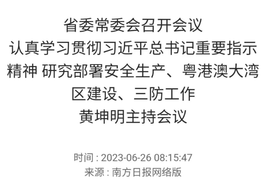 省委常委会召开会议 认真学习贯彻习近平总书记重要指示精神 研究部署安全生产、粤港澳大湾区建设、三防工作(新闻稿)