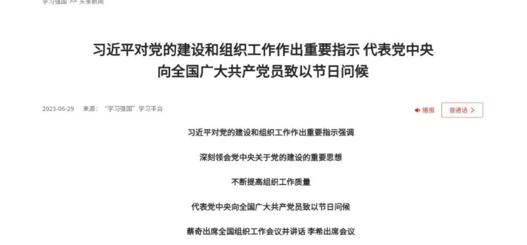 习近平总书记对党的建设和组织工作作出重要指示 代表党中央向全国广大共产党员致以节日问候(新闻稿)