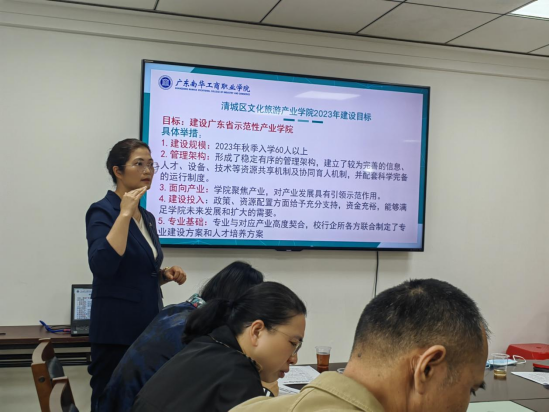 会上,谭金凤副院长首先2022年清城区文化旅游产业学院在人才培养、专业建设、服务区域经济、加深校企合作、产学研等方面取得的成果进行了汇报;其次对2023年产业学院的工作目标,具体举措进行了详细的阐述。谭金凤副院长的汇报得到了清城区文化广电旅游体育局郭桂星局长、陈倩华副局长,清远市旅游协会张秀莲秘书长的充分认可和赞同。