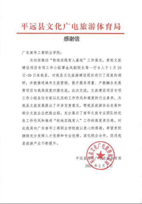 为切实推动“校地实践育人基地”工作落实落地,我校文旅建设项目专项工作小组 9 人在文化旅游学院副院长谭金凤的带领下,于2021年1月25-30日赴梅州市平远县,就扎实开展文旅建设项目,进行对接交流。