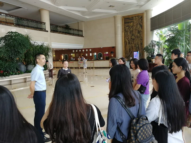 同学们乘坐企业专车到达企业,广州从化碧水湾温泉度假村副总经理张彦浩先生、人力资源部罗俊华副经理、前厅接待朱平开(2017届碧水湾班毕业生)和陈桂晴(2015级碧水湾班学生)接待了师生一行。在罗经理的带领下,师生参观了碧水湾的前厅部、餐厅、客房、温泉木屋区、康乐中心、制服部、员工之家(员工宿舍和员工餐厅)等区域,详细地介绍了各部门的运营情况。在参观过程中,同学们亲身感受到了企业文化中亲情服务的魅力,每一个员工都是笑脸迎客,认真关注客人需求。