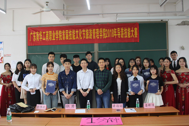 为提高学生专业技能,营造活跃的校园文化氛围,旅游管理学院于4月27日上午在清远校区教学楼419课室,举办了我校首届技能文化节之导游技能大赛(半决赛)。清远市导游协会副会长兼秘书长张勇、我院旅游管理系主任梁滔滔、旅游管理专业负责人郭伟欣、专任教师潘新洁出席此次活动并担任评委。