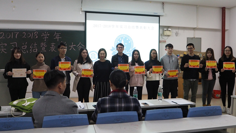 会议第三项议程,黄隽老师宣读了《关于表彰广东南华工商职业学院旅游管理系2017年秋交会优秀实习生的决定》,23人受到表彰,关惠贞、张彭博老师分别为获奖同学颁奖。
