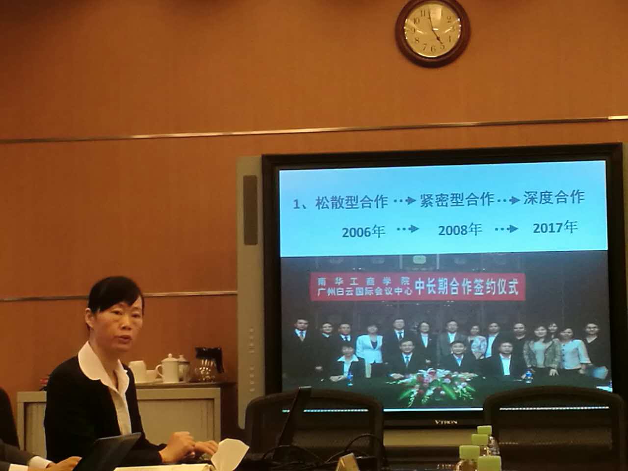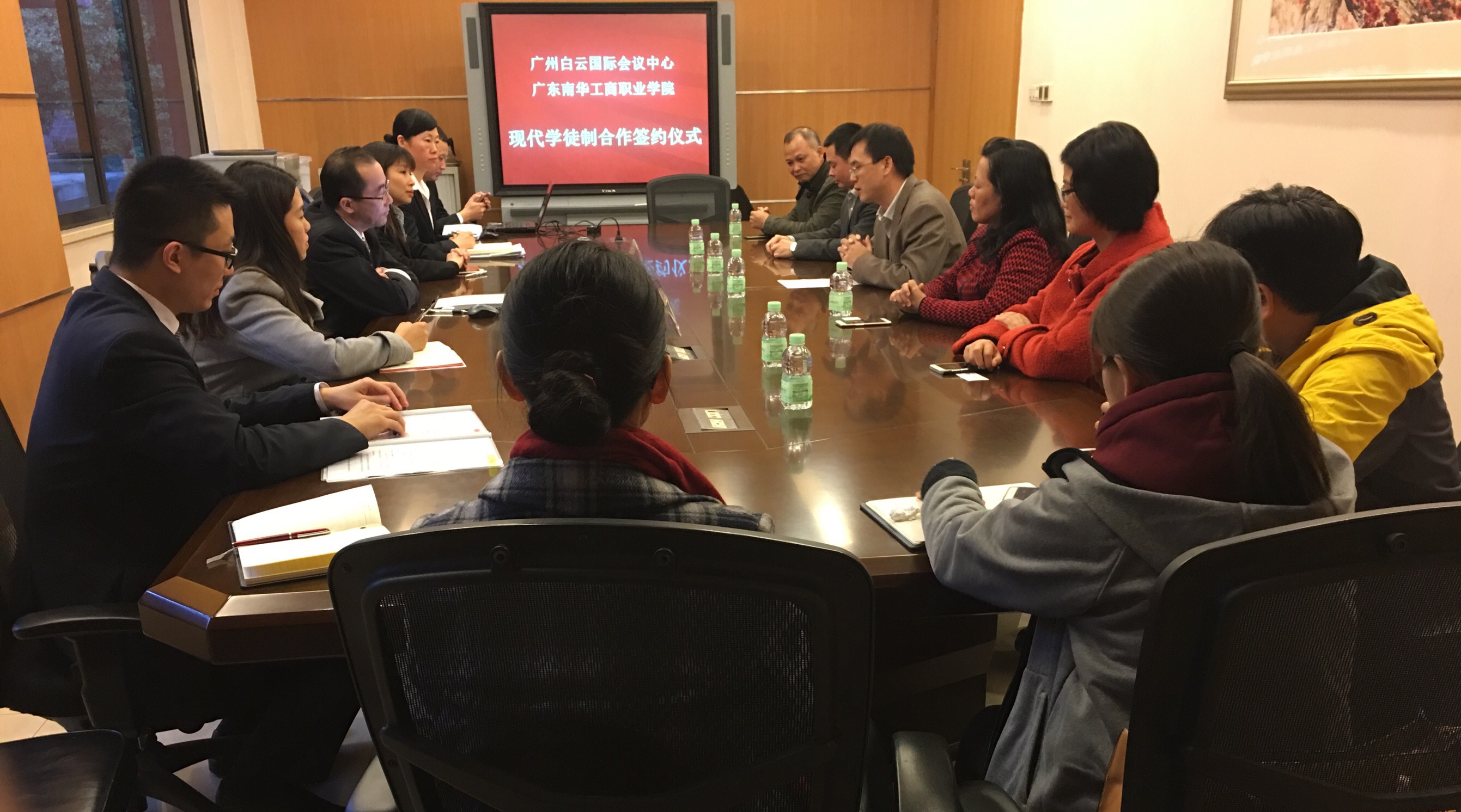 2017年11月24日下午四点四十五分在广州白云国际会议中心,广东南华工商职业学院与广州白云国际会议中心举行现代学徒制合作签署仪式。广州白云国际会议中心总经理雷州先生,会展宴会部总监周凡女士,房务部总监邹倩雅女士,人力资源部经理柴新女士、行政助理郑志工先生、招聘主管曾明先生、人事专员邓秋娣女士和陈静斌先生,以及我校严新副校长,旅游管理系胡家夏主任,学校办公室余柱青副主任,旅游管理系谭金凤副主任和张树清、陈丽芳、王晓强、杨小衡老师出席参加本次仪式。