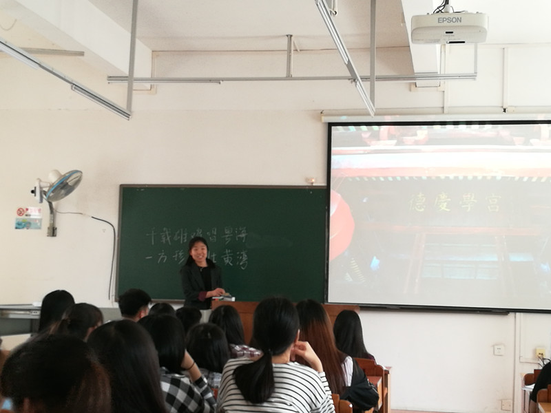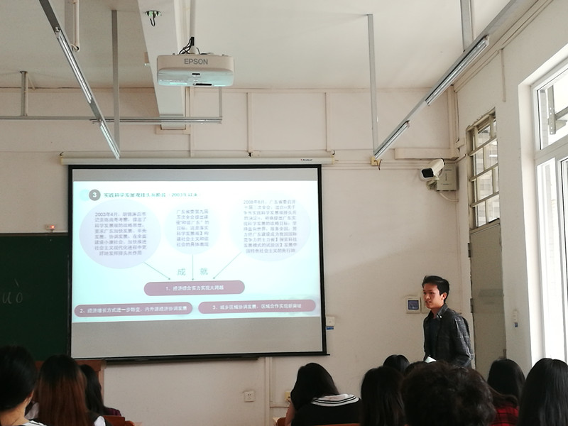 广东导游基础知识课程的开设旨在提升与巩固学生对旅游专业学识的理解,提高与完善学生获取导游资格所需的技能。对此,潘新洁老师“因材施教”——因课程材料的难易程度施用不同的教学方法。针对较为重要、需要老师引导的知识点,潘老师会亲自着重解析;而对于难度较小的知识点,潘老师主张由学生小组通过课堂展示的形式习得。本次课程的小组展示主题是改革开放以后经济社会概况,学生概述了改革开放各阶段发展特点和意义。这是学生对学问进行认识、理解、总结的过程,通过自学并复述,形成自身的知识系统。如此设置也有利于学生培养团队合作意识、加强课件制作能力、学会在临场发挥中组织语言、活跃气氛等技巧,为日后导游考证、导游比赛等活动奠定基础。