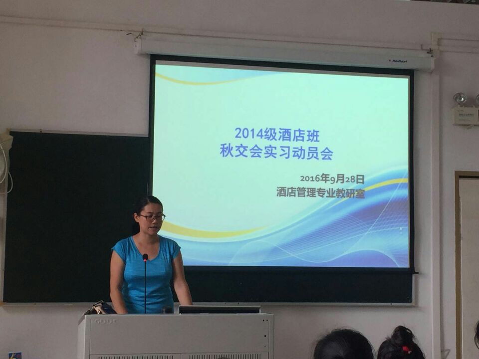 为了加强我系实习工作的指导,让学生顺利完成秋交会实习,2016年9月28日下午,旅游管理系2014级酒店管理班在黄埔校区南区C101课室召开动员大会,会议由酒店管理专业负责人陈丽芳老师主持。