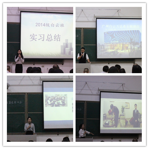 活动分为两部分,第一部分是2015-2016实习总结汇报。根据人才培养方案、教学计划,14级白云班于2015-2016学年第一学期到白云国际会议中心开展了为期半年的顶岗实习,14级旅游管理班、酒店管理班于2016年4月起开展为期一个月的春交会实习。本次春交会实习中,88名同学分别到了广州保利假日酒店、白云万达希尔顿酒店、广州科尔海悦酒店、广州颐和盛世、裕通大酒店、远洋宾馆、威珀斯酒店、中国市长大厦以及旅行社开展实习活动。在汇报中,同学们纷纷感谢学校以及企业给予的帮助和支持,通过亲身的实践,提高了自身的专业素质,变得更有自信,向职业人的路径出发。