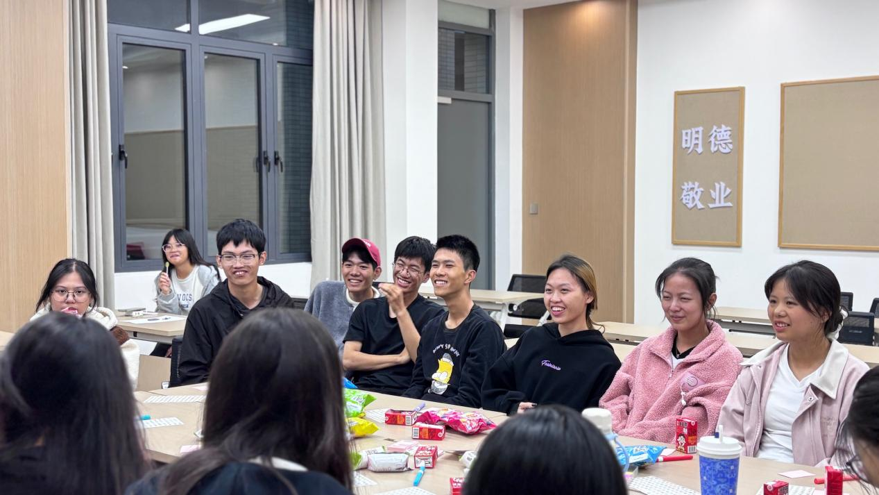 随后以“宿舍生活小共鸣”作为切入点,借助击鼓传花的游戏,引导大家分享宿舍里的乌龙趣事、暖心瞬间以及共同的经历,现场氛围轻松且活跃。