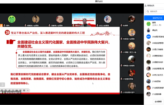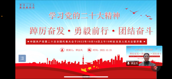 2 022 1 2 2 3 19时,文化旅游学院党支部12月主题党日活动顺利举行,由文化旅游学院党支部书记谭金凤以“踔厉奋发,勇毅前行,团结奋斗”为题作主题党课讲授。学院全体党员教师、20级预备党员、 21级 入党积极分子 2 2 级入党申请人、各年级 学生 干部一同 参加学习。
