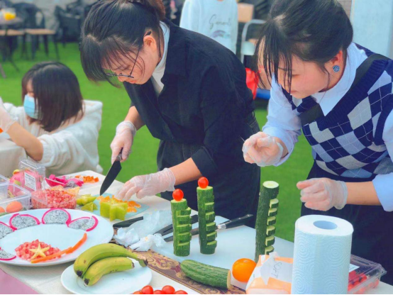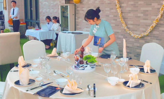 伴随着主持人对大赛内容的相关介绍,赛事如火如荼地开展起来。专业组和业余组的各位选手火速投入创作,专心致志,精雕细琢。比赛期间,文化旅游学院2019级酒店管理与数字化运营专业的林洁和王晓格同学展示了专业的中式摆台和法式摆台,获得现场观众的一致好评。