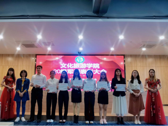 为鼓励学生保持军训成果,弘扬军训生活中的优良品质,文化旅游学院于2021年11月4日下午在图书馆报告厅举行了军训表彰大会。文化旅游学院副院长谭金凤,院长助理陈晓华,辅导员熊汝鑫、黄隽、柯沛葱、王宏博、刘晓欢以及2020级军训优秀学员、学生代表等出席了本次军训表彰大会。