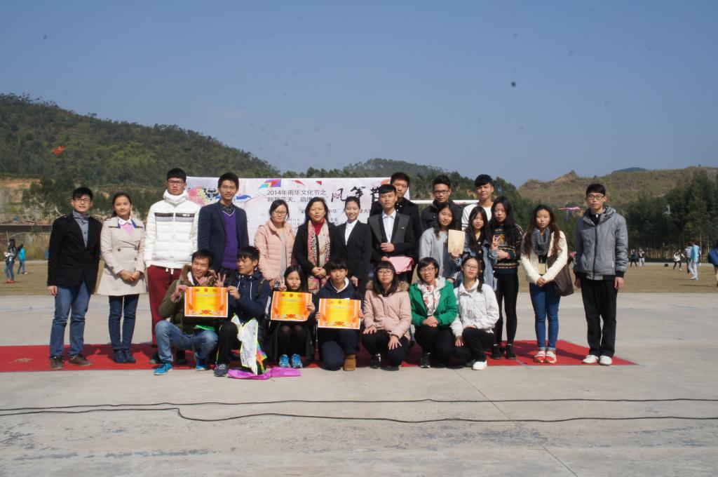 旅游管理系主任胡家夏老师、院团委副书记方永航老师、院团委刘晓玲老师、旅游管理系马佩佩老师和黄隽老师以及各二级学院、系学生代表应邀出席了本次活动。来自各二级学院、系的11支参赛队伍与观众一起将自己亲手制作的风筝放飞于南华的天空中。