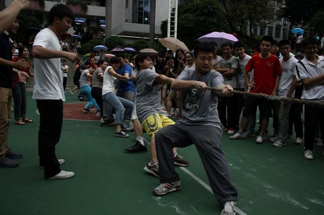 由学院团委主办、旅游管理系承办的天河校区“活力2013”夏季趣味运动于5月20日在天河校区彩色篮球场开幕,目前已进入最后的比赛阶段。本次比赛旨在深化我院的教育特色,培养学生体育锻炼的兴趣和顽强拼搏的团队合作精神,有来自旅游管理系、法律系、劳动关系系,共十三支队伍600多名运动员参与其中。比赛的项目有:拔河,集体跳绳,蒙眼敲锣,袋鼠赛跑和勇往直前六项。现在拔河、集体跳绳、蒙眼敲锣三个项目已经比赛结束。在拔河比赛项目中:旅游管理系12级烹饪班获得冠军、法律系1班代表队获得亚军、旅游管理系12级伯顿班获得季军。